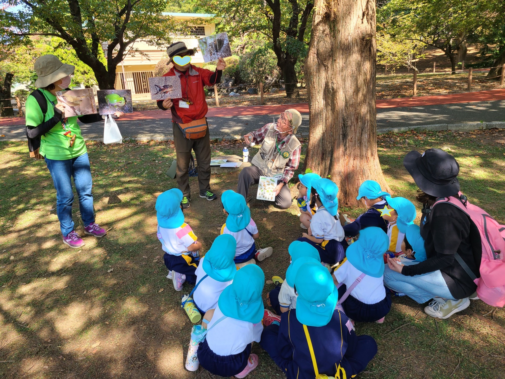 秋晴れ。すがすがしい気候になりました。3・4・5歳児さん。福岡市環境局による出前授業『自然となかよくなろう!』ネイチャーゲームを行いました。①自然の中に隠れる生き物探し(カモフラージュ)②自然の中の宝物探し(沢山の隠れた木の実や葉っぱ)③自然の音を感じようの3つのアクテビティを体験しました。インストラクターさんと一緒に観察すると気づかなかった木の実や葉っぱもたくさん。くしゃくしゃっと握ると香りがしてくる樟脳の葉っぱ、穴のあいた葉っぱを使って景色を見たり、聴診器で木の音を聞いたり。日ごろから遊び慣れている山王公園で新しい発見と自然を満喫した1日でした。8名のインストラクター、指導員の皆さんが、子ども達の質問や見たい!触りたい!やりたい!気持ちにじっくりと付き合ってくださいました。素敵な時間をありがとうございました。