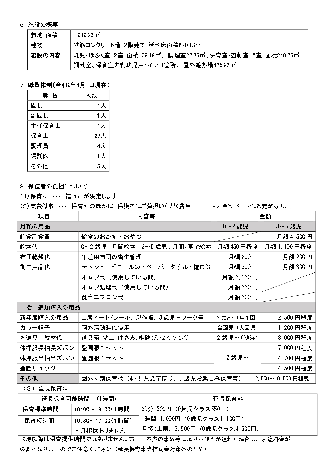 | 保育料 | ①保育料は福岡市が決定します。 ②保育料の他に、保護者に負担いただく費用があります。 *重要事項説明書に記載 |